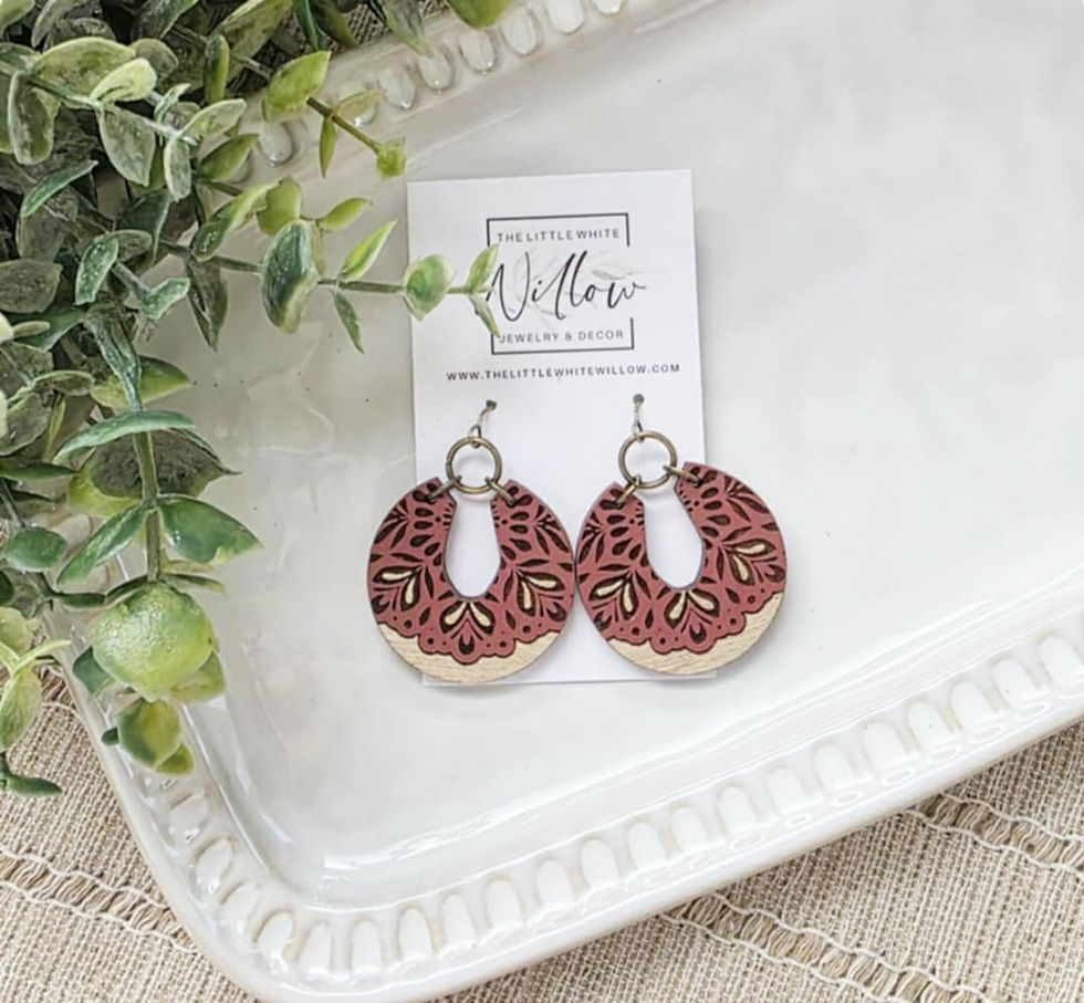 Distressed Burgundy Mandala Engraved Wood Earrings